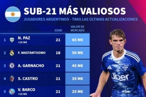 体育资讯1月8日讯 德国转会市场统计了阿根廷U21球员的身价,并列出榜单,尼科·帕斯6500万欧居首,马斯坦托诺5000万欧次席。