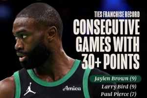 凯尔特人官方晒出统计,杰伦·布朗连续9场比赛砍下30+,追平拉里·伯德保持的队史纪录!