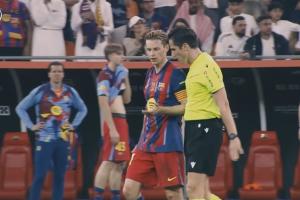 比赛尾声德容铲倒姆巴佩时,裁判团队提醒穆努埃拉:“红牌!红牌!他踢到对方的胫骨了!”德容对红牌表示否认:“我没有用力,而且碰到球了。”穆努埃拉回答他:“你亮了鞋钉,非常明显,红牌确认,弗兰基,请你离场!”