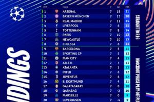 目前欧冠前二名阿森纳和拜仁确定了直通16强名额,但有且仅有他们两队。从第3的皇马往后数,有13支球队将竞争直通淘汰赛的名额,其中第6巴黎到第13亚特兰大均为13分,8队同分竞争难度可想而知。