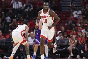喜笑颜开!杜兰特外线开火连续三分命中 帮助火箭占据主动