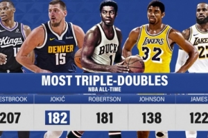 在本场比赛中,约基奇拿到生涯第182次三双,超越奥斯卡·罗伯特森,上升至NBA历史第二。