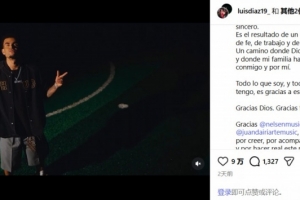 体育资讯1月3日讯 拜仁球星路易斯·迪亚斯不仅有着出色的进球能力,哥伦比亚人也是一位音乐爱好者。在新年来临之际,迪亚斯在INS上发布了一段音乐视频。特别之处在于,这是他个人第一首单曲的官方MV!