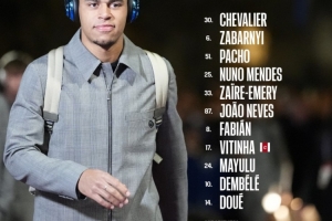 30-舍瓦利耶、6-扎巴尔尼、51-帕乔、25-努诺·门德斯、33-扎伊尔·埃梅里、87-若昂·内维斯、8-法比安·鲁伊斯、17-维蒂尼亚、24-马尤卢、10-登贝莱、14-杜埃