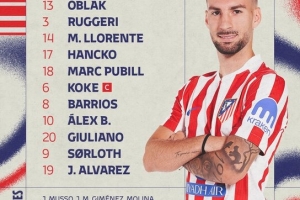 13-奥布拉克、3-鲁杰里、14-马科斯·略伦特、17-汉茨科、18-普比尔、6-科克、8-巴里奥斯、10-巴埃纳、20-朱利亚诺·西蒙尼、9-瑟尔洛特、19-阿尔瓦雷斯
