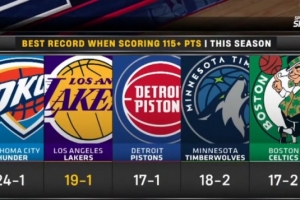 Top5依次是:雷霆、湖人、活塞、森林狼、凯尔特人
